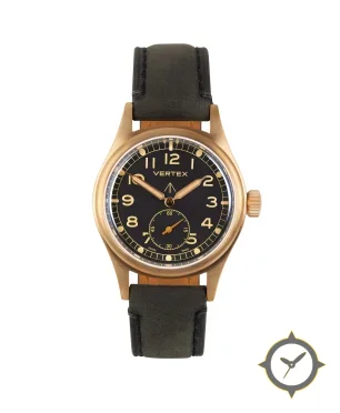 A Military watch with a vintage-inspired 37.5mm case, crafted from bronze featuring a black dial with a unique matte finish.