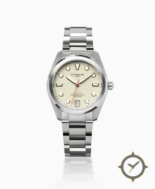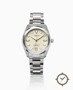 A Sports watch with a vintage-inspired 34mm case, crafted from stainless steel featuring a white dial with a unique grained finish.
