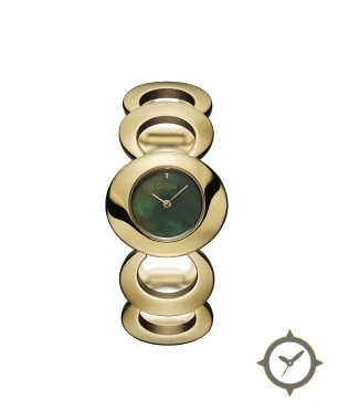 A Dress watch with a vintage-inspired 36.5mm case, crafted from gold featuring a green dial with a unique mother-of-pearl finish.