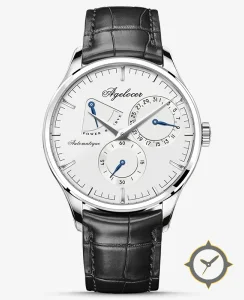 A Dress watch with a bold 44mm presence on the wrist, crafted from stainless steel featuring a white dial with a unique matte, slightly recessed subdials finish and a helpful power reserve indicator.