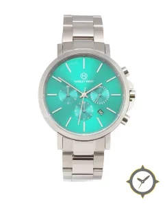 A Chronograph watch with a versatile 38.5mm case, that suits most wrists, crafted from stainless steel featuring a turquoise dial with a unique sunburst finish.