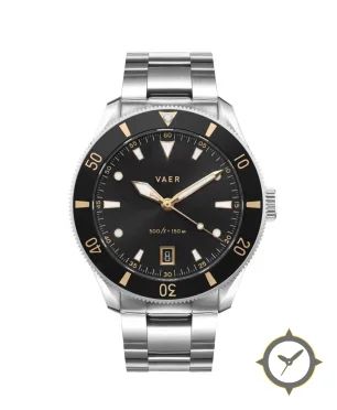 A Dive watch with a bold 44.5mm presence on the wrist, crafted from stainless steel featuring a black dial with a unique sunburst finish.