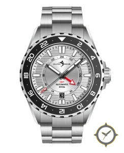 A GMT watch with a vintage-inspired 37mm case, crafted from stainless steel featuring a silver dial with a unique horizontal ribbed texture finish and a true GMT complication for tracking a second time zone.