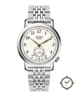 A Dress watch with a vintage-inspired 32mm case, crafted from stainless steel featuring a white dial with a unique smooth lacquer finish.