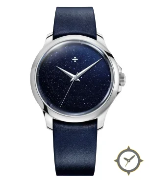 A Dress watch with a vintage-inspired 32mm case, crafted from stainless steel featuring a navy dial with a unique aventurine (sparkling, starfield) finish.