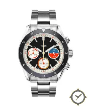 A Chronograph watch with a vintage-inspired 34.5mm case, crafted from stainless steel featuring a black dial with a unique matte finish.