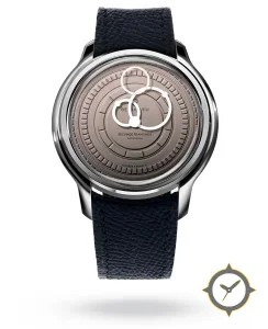 A Minimalist watch with a vintage-inspired 34mm case, crafted from stainless steel featuring a brown dial with a unique concentric circular stepped rings (radial guilloché) finish.