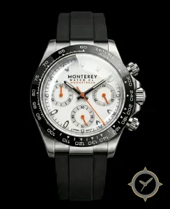 A Chronograph watch with a bold 43.5mm presence on the wrist, crafted from stainless steel featuring a white dial with a unique smooth lacquer finish.