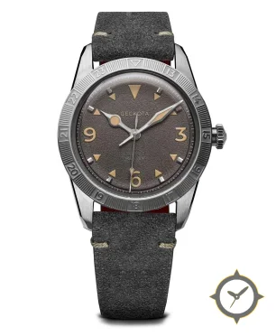 A Vintage watch with a vintage-inspired 31.5mm case, crafted from stainless steel featuring a brown dial with a unique granular / sandblasted texture finish.