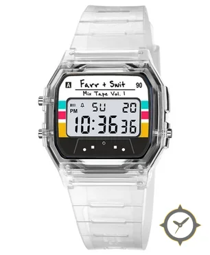 A Digital watch with a vintage-inspired 36.5mm case, crafted from resin featuring a white dial with a unique LCD/digital finish.
