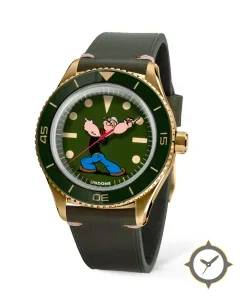A Dive watch with a vintage-inspired 34mm case, crafted from gold featuring a green dial with a unique matte, printed character motif finish.