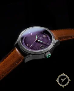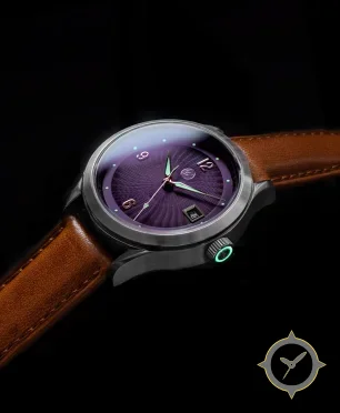 A Dress watch with a vintage-inspired 34mm case, crafted from stainless steel featuring a purple dial with a unique guilloche wavy/ripple texture finish.