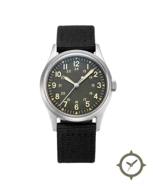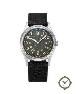 A Field watch with a vintage-inspired 36mm case, crafted from stainless steel featuring a black dial with a unique matte grained finish.