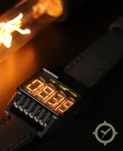 A Digital watch, crafted from stainless steel featuring a orange dial with a unique nixie tube display finish.