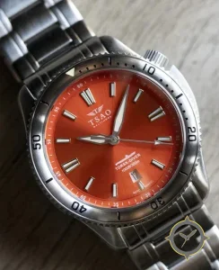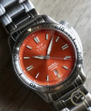 A Dive watch with a bold 51.5mm presence on the wrist, crafted from stainless steel featuring a orange dial with a unique sunburst finish.