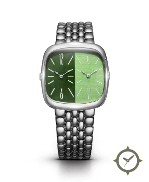 A Dress watch with a vintage-inspired 30.5mm case, crafted from stainless steel featuring a green dial with a unique vertical brushed (sunray) finish.