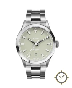 A Field watch with a vintage-inspired 32mm case, crafted from stainless steel featuring a green dial with a unique matte finish.