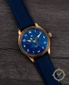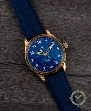 A Pilot watch with a bold 42mm presence on the wrist, crafted from gold featuring a blue dial with a unique mottled stone / lapis-like texture finish.