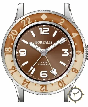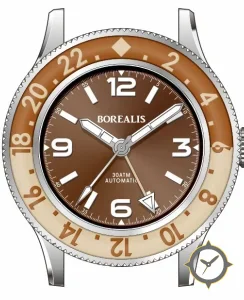 A GMT watch with a vintage-inspired 33.5mm case, crafted from stainless steel featuring a brown dial with a unique sunburst finish and a true GMT complication for tracking a second time zone.