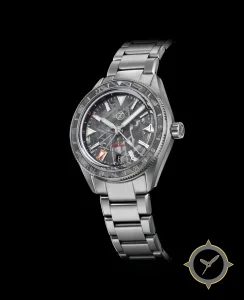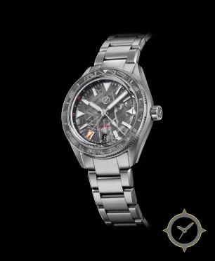 A GMT watch with a bold 42.5mm presence on the wrist, crafted from stainless steel featuring a gray dial with a unique meteorite finish and a true GMT complication for tracking a second time zone.