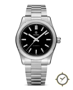 A Sports watch with a vintage-inspired 30.5mm case, crafted from stainless steel featuring a black dial with a unique glossy lacquer finish.