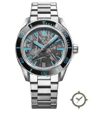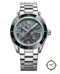 A Dive watch with a bold 44mm presence on the wrist, crafted from stainless steel featuring a gray dial with a unique meteorite finish.