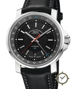 A GMT watch with a bold 44mm presence on the wrist, crafted from stainless steel featuring a black dial with a unique matte with concentric/ringed sections finish and a true GMT complication for tracking a second time zone.