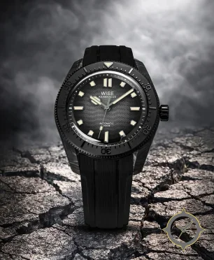 A Dive watch with a vintage-inspired 37mm case, crafted from carbon featuring a black dial with a unique Damascus-style herringbone/chevron textured finish finish.