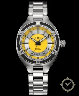 A Dive watch with a bold 42.5mm presence on the wrist, crafted from stainless steel featuring a yellow dial with a unique brushed center with sunburst outer ring finish.