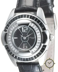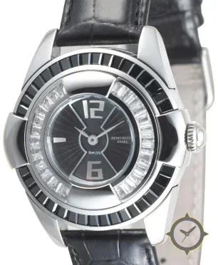 A Luxury watch, crafted from stainless steel featuring a black dial with a unique sunburst finish.