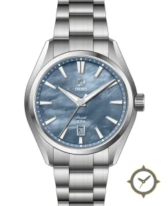 A Sports watch with a versatile 39mm case, that suits most wrists, crafted from stainless steel featuring a blue dial with a unique mother-of-pearl (nacre, slightly wavy/iridescent) finish.