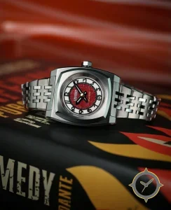 A Sports watch with a vintage-inspired 30.5mm case, crafted from stainless steel featuring a red dial with a unique guilloche / concentric sunburst finish.