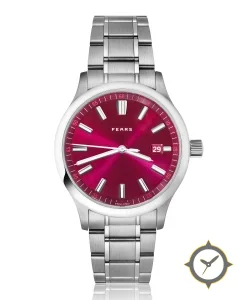 A Sports watch with a bold 46mm presence on the wrist, crafted from stainless steel featuring a red dial with a unique sunburst finish.