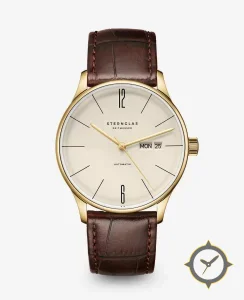 A Dress watch with a vintage-inspired 30.5mm case, crafted from gold featuring a white dial with a unique matte finish.