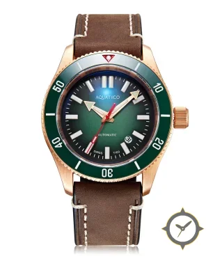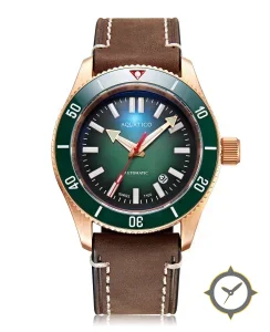 A Dive watch with a bold 48mm presence on the wrist, crafted from bronze featuring a green dial with a unique fumé sunburst finish.