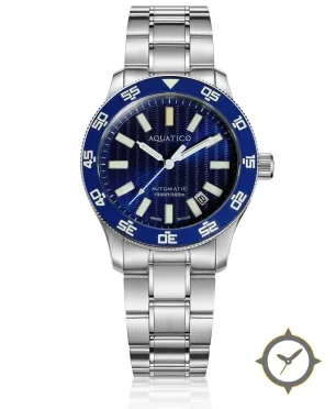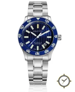 A Dive watch with a vintage-inspired 31.5mm case, crafted from stainless steel featuring a blue dial with a unique textured with wave pattern / slight sunburst effect finish.