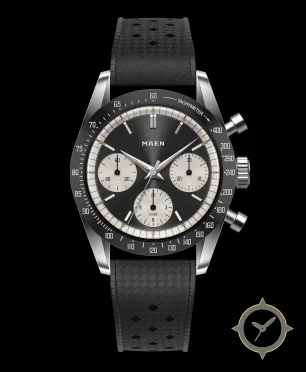 A Chronograph watch with a vintage-inspired 36.5mm case, crafted from stainless steel featuring a black dial with a unique sunburst (radial brushed) finish.