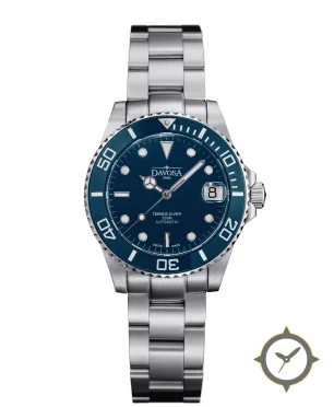 A Dive watch with a vintage-inspired 33.5mm case, crafted from stainless steel featuring a blue dial with a unique sunburst finish.