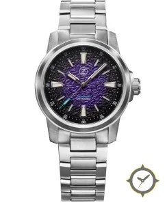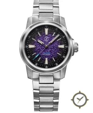 A Dive watch with a vintage-inspired 37.5mm case, crafted from stainless steel featuring a purple dial with a unique textured crinkled/wave (hammered) finish finish.