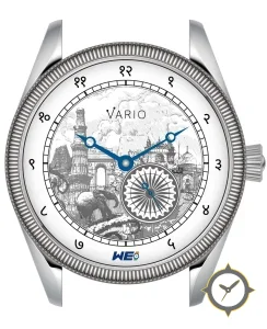 A Dress watch with a vintage-inspired 33mm case, crafted from stainless steel featuring a white dial with a unique engraved/illustrated print finish.
