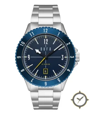 A Sports watch with a vintage-inspired 34mm case, crafted from stainless steel featuring a blue dial with a unique sunburst finish.