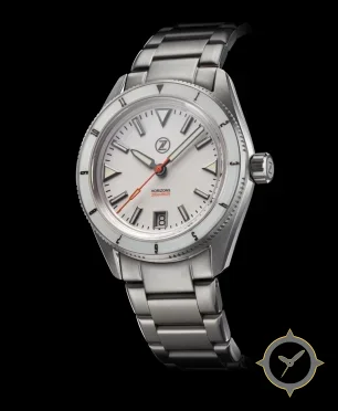 A Dive watch with a bold 41.5mm presence on the wrist, crafted from stainless steel featuring a white dial with a unique sunburst / radial brushing finish.