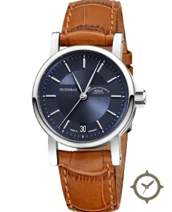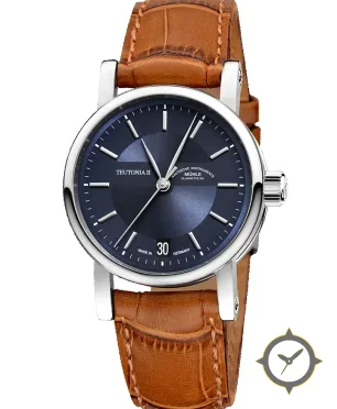 A Dress watch with a vintage-inspired 33mm case, crafted from stainless steel featuring a blue dial with a unique sunburst finish.