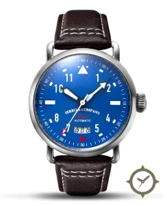 A Pilot watch with a vintage-inspired 34.5mm case, crafted from stainless steel featuring a blue dial with a unique matte finish.