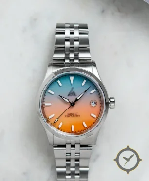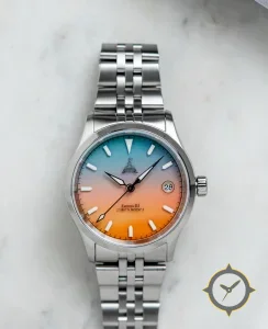 A Sports watch with a vintage-inspired 31.5mm case, crafted from stainless steel featuring a turquoise dial with a unique ombré gradient (turquoise to orange) with subtle sunburst finish finish.