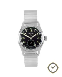 A Military watch with a vintage-inspired 29.5mm case, crafted from stainless steel featuring a black dial with a unique matte finish.