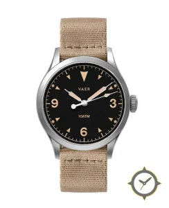 A Field watch with a vintage-inspired 35.5mm case, crafted from stainless steel featuring a black dial with a unique matte finish.