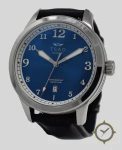 A Pilot watch with a bold 44.5mm presence on the wrist, crafted from stainless steel featuring a blue dial with a unique sunburst finish.