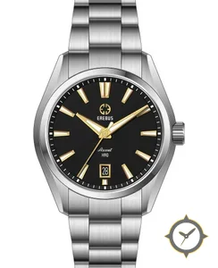 A Dress watch with a vintage-inspired 34.5mm case, crafted from stainless steel featuring a black dial with a unique smooth matte finish.