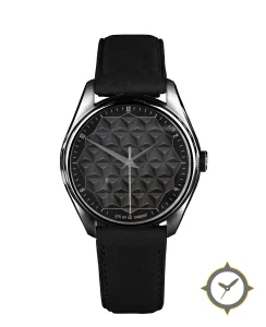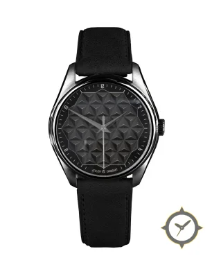 A Minimalist watch with a vintage-inspired 31.5mm case, crafted from stainless steel featuring a black dial with a unique embossed 3D geometric tessellated pyramid texture finish.